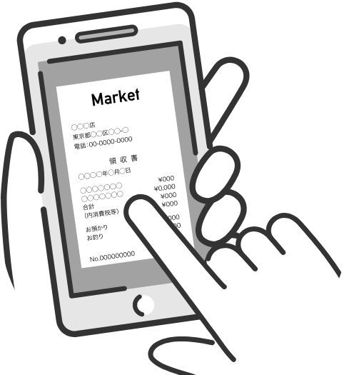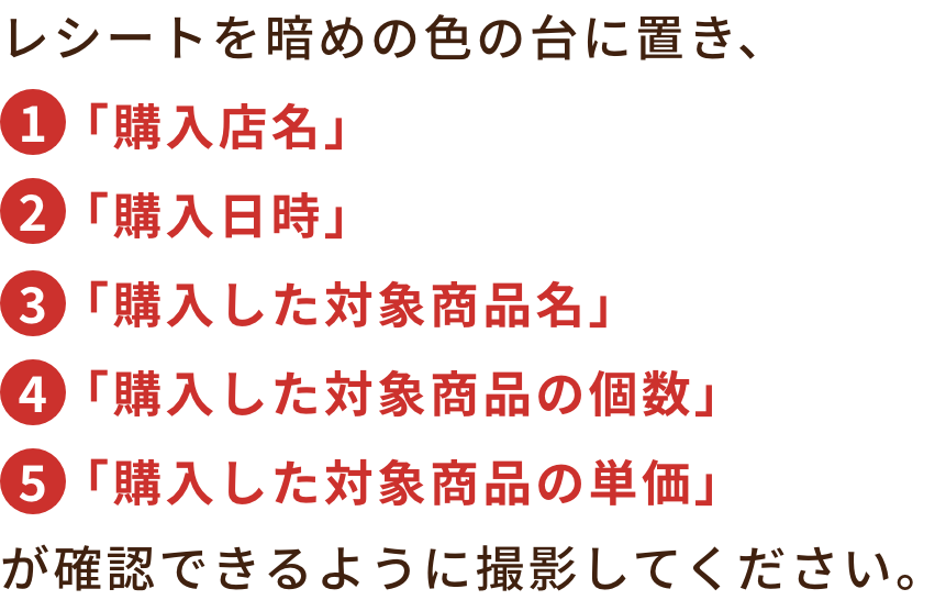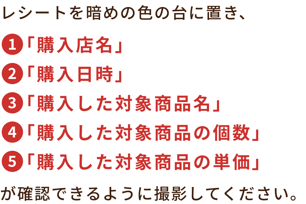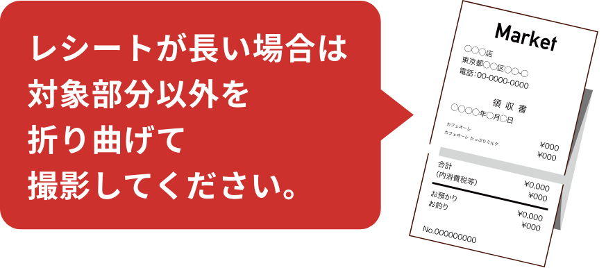 暗めの台にレシートを置き、必ず真上から水平になるように撮影してください。