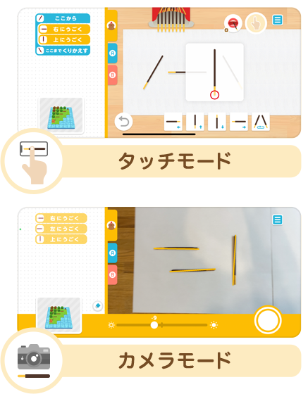 アプリ上でポッキーを動かす「タッチモード」か、並べたポッキーをカメラで読み込む「カメラモード」で、ハグハグを動かします。