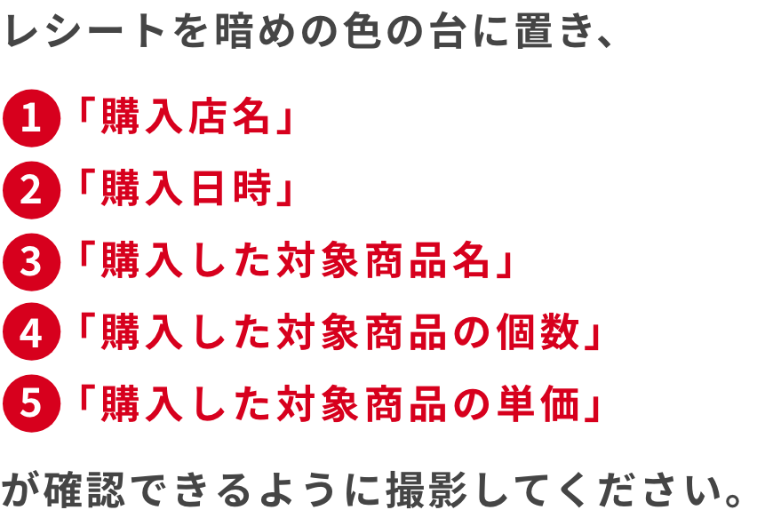 「購入した対象商品の個数」「購入した対象商品の単価」が確認できるようにレシートを撮影し、アップロードしてください。